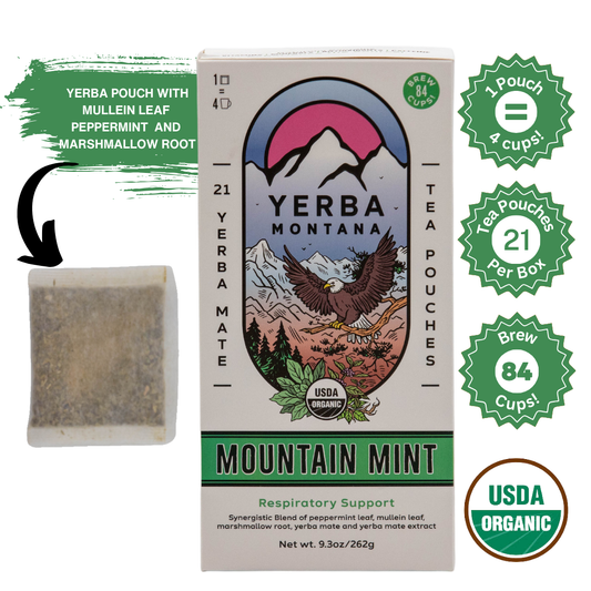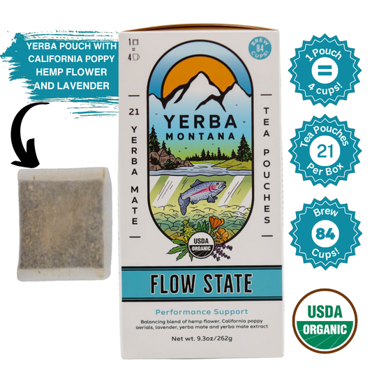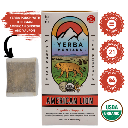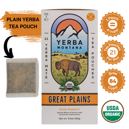 Functional yerba mate blends in 4 cup plastic free yerba mate tea pouches.